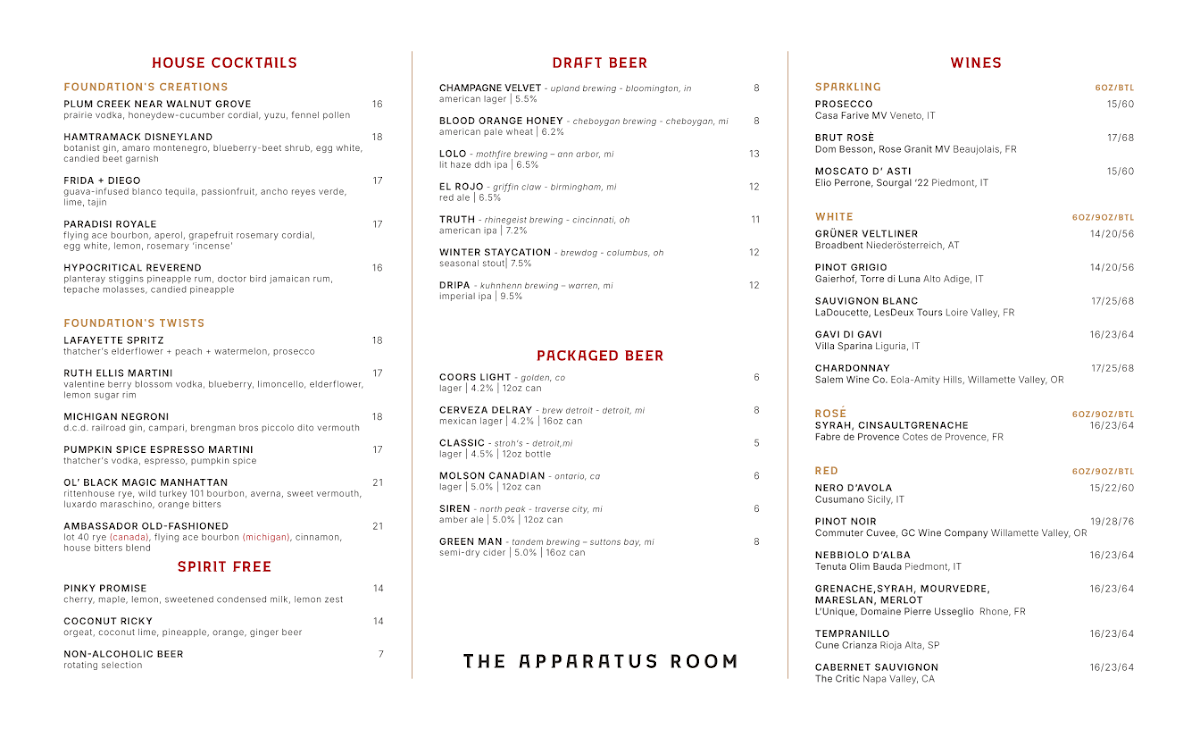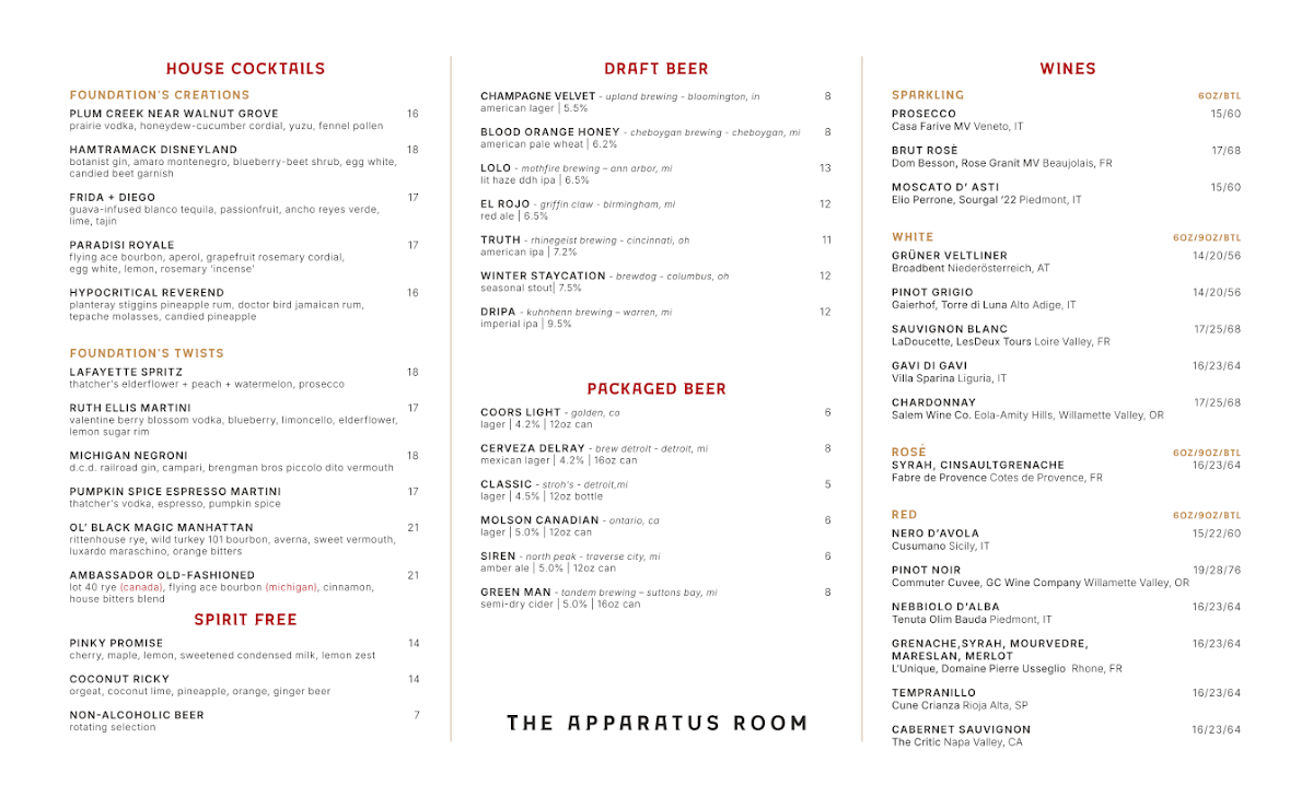 Welcome to The Apparatus Room, a distinguished New American restaurant nestled in the heart of Detroit at 250 W Larned St. Just a stone's throw from the bustling convention center, this culinary gem is set in a beautifully preserved historic building, offering an ambiance that captures the essence of both sophistication and warmth. With a mix of modern decor and classic architecture, the restaurant provides a stunning backdrop for an exquisite dining experience.